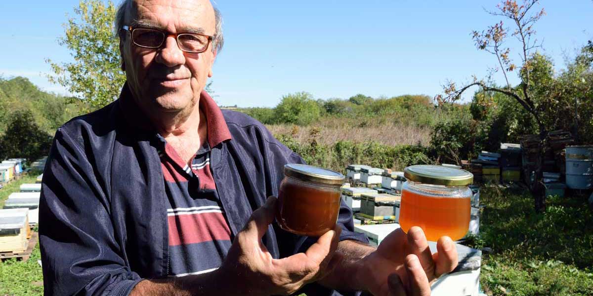 Handwerker von Beruf war die Imkerei erst ein Hobby. Jetzt stehen 77 Bienenstöcke auf einem Gelände im Umfeld von Goumenssa. Akazien und Pinien liefern den Nektar für die Bienen. Honigprodukte wie Propolis helfen bei Erkältungskrankheiten.